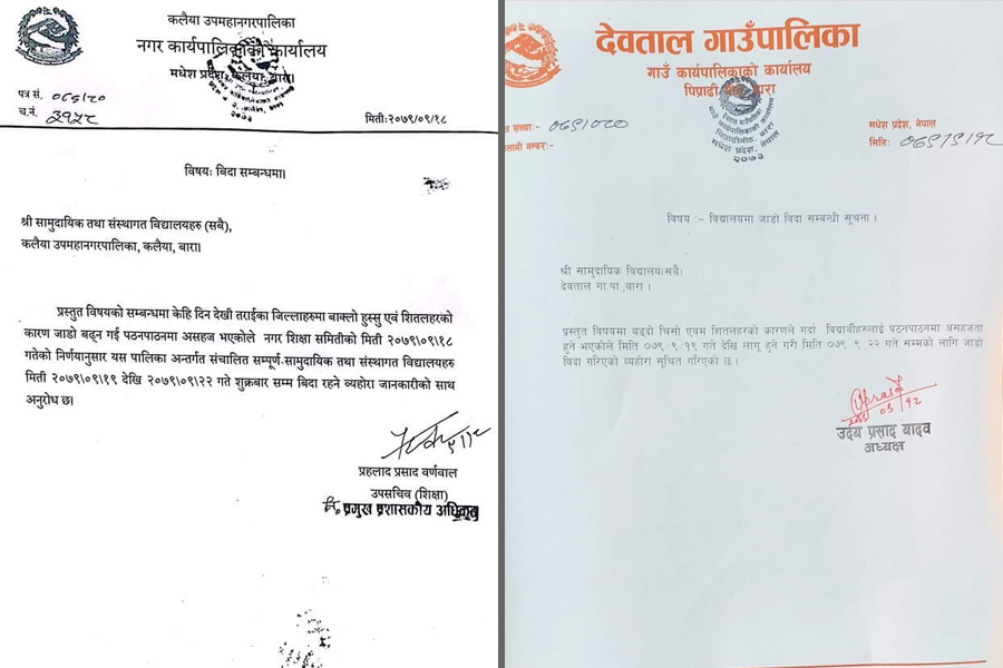 बाराको कलैया उपमहानगरपालिकाले सूचना जारी गर्दै चिसोका कारण पठनपाठनमा समस्या भएकाले विद्यालयमा चार दिनको बिदा दिएको छ ।