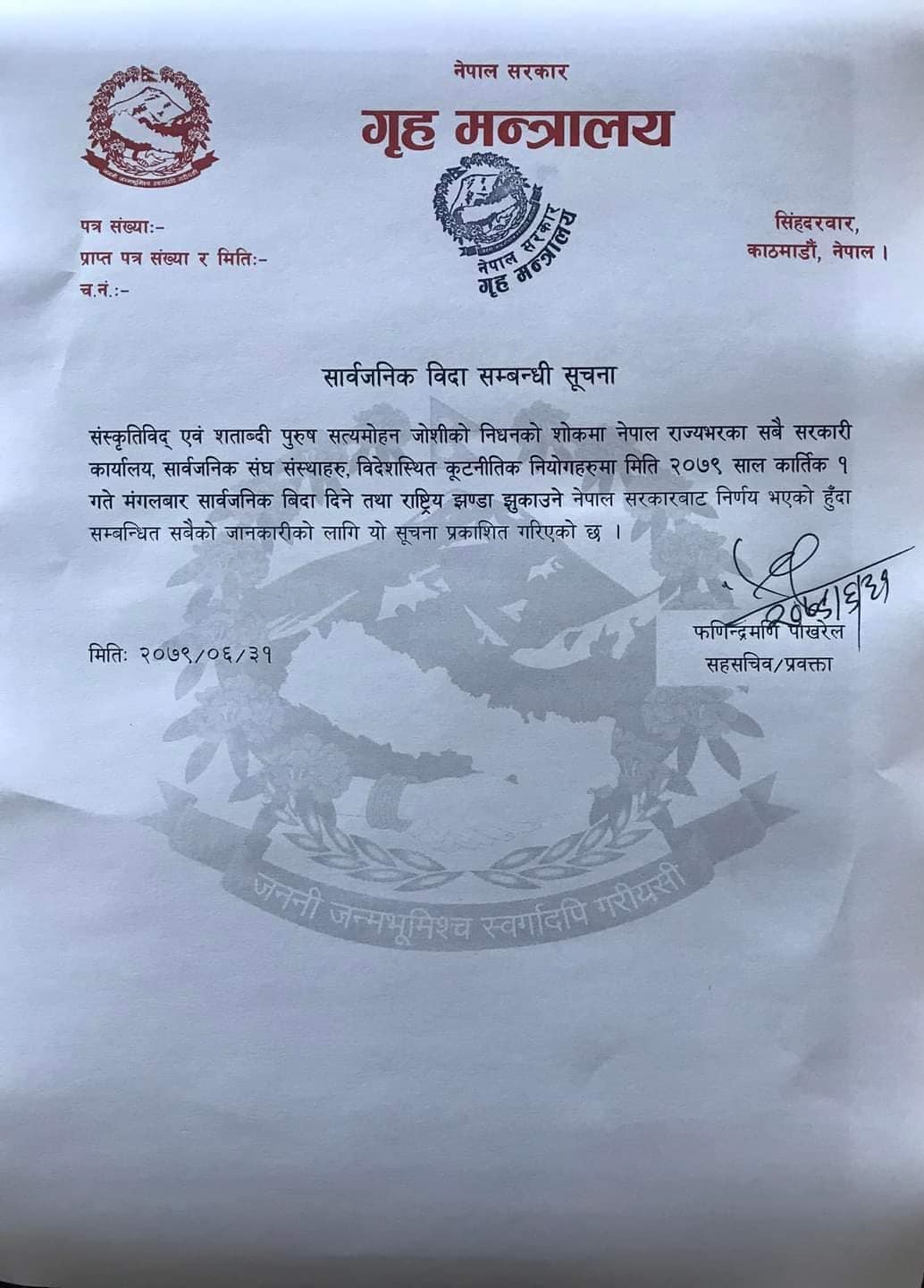गृह मन्त्रालयका प्रवक्ता फणिन्द्रमणि पोखरेलले जोशीको निधनको शोकमा सरकारी कार्यालय, सार्वजनिक संघसंस्था, विदेशस्थित कूटनीतिक नियोगहरुमा कात्तिक १ गते मङ्गलबार सार्वजनिक दिने निर्णय भएको जानकारी दिनुभयो ।