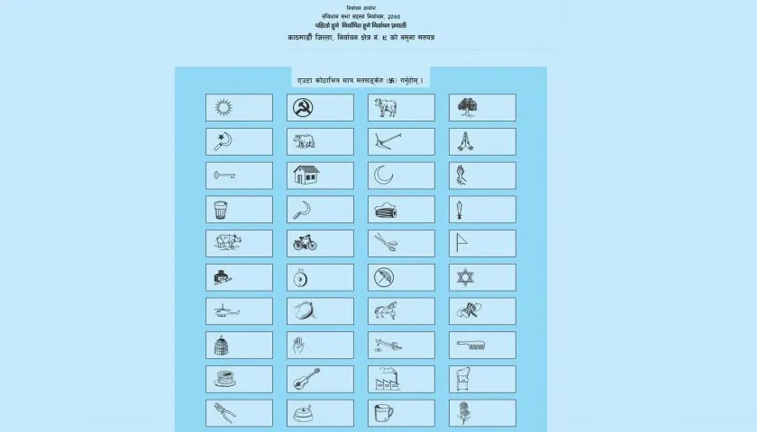 यस पटक पहिलो हुने निर्वाचित हुने निर्वाचन प्रणालीतर्फ निर्वाचन क्षेत्रमा उम्मेदवारको मनोनयनपत्र दर्ता भई अन्तिम नामावलीमा कायम उम्मेदवारको निर्वाचन चिन्ह मात्र समावेश गरी मतपत्र छपाइ गरिएको निर्वाचन आयोगका प्रवक्ता शालिग्राम शर्मा पौडेलले बताउनुभयो ।